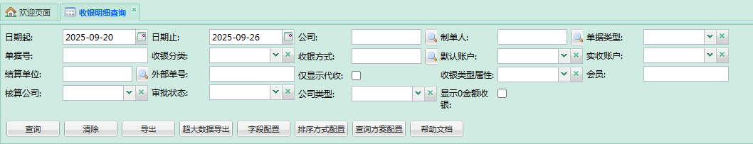 - 收银方式:文本搜索框,根据单据所选收银方式进行查询