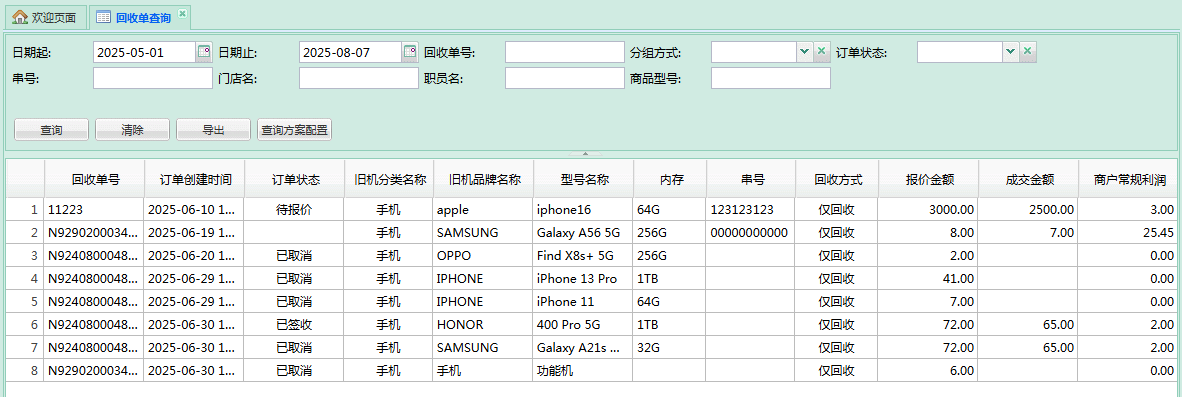 - 订单状态:显示回收业务的进展,依实际业务流程更新;