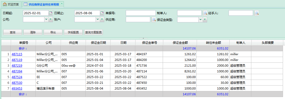 - 转往来金额:显示业务单供应商保证金转往来金额;