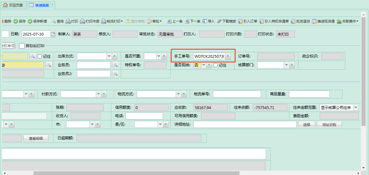- 拉取旺店通数据,会将旺店通单据号,填充到手工单号中