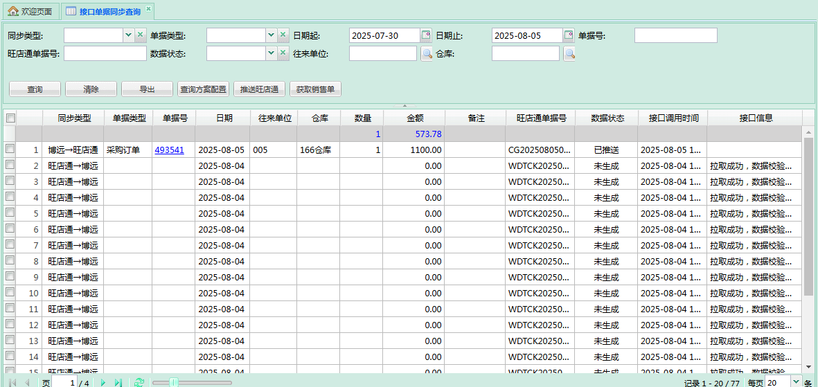 - 查询与旺店通之间同步的单据列表,所有拉取及推送记录都在这里查看