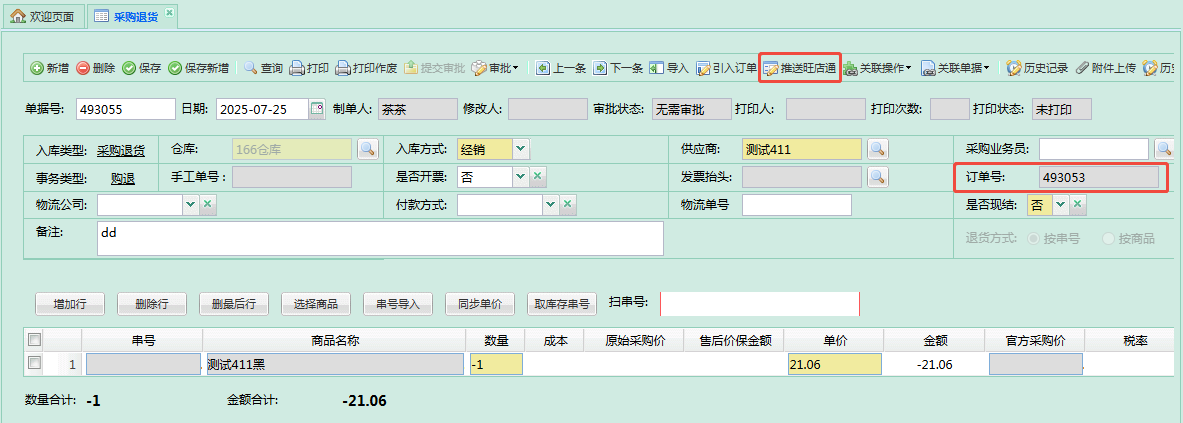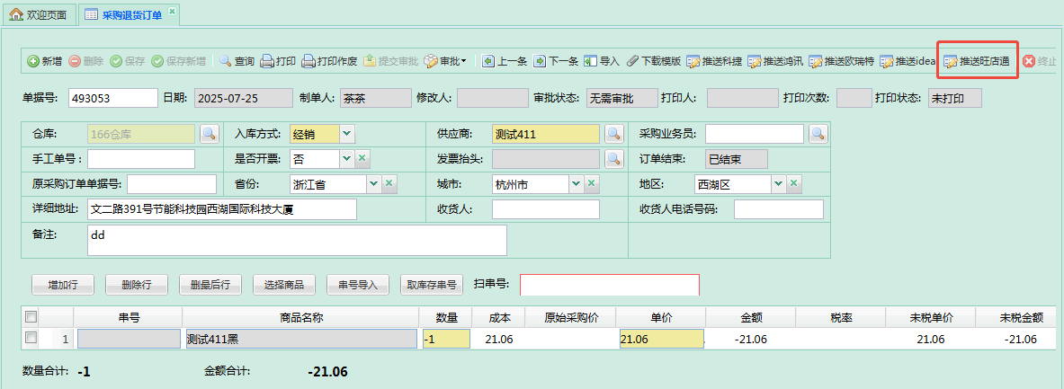 - 采购订单、采购入库单、采购退货订单、采购退货单头部增加 推送旺店通 按钮,可分配按钮权限;