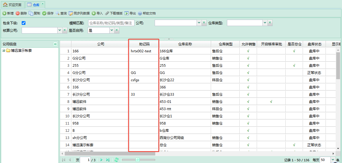 3.3、在【基础数据】—【仓库】— 助记码 中,填写旺店通 仓库编码