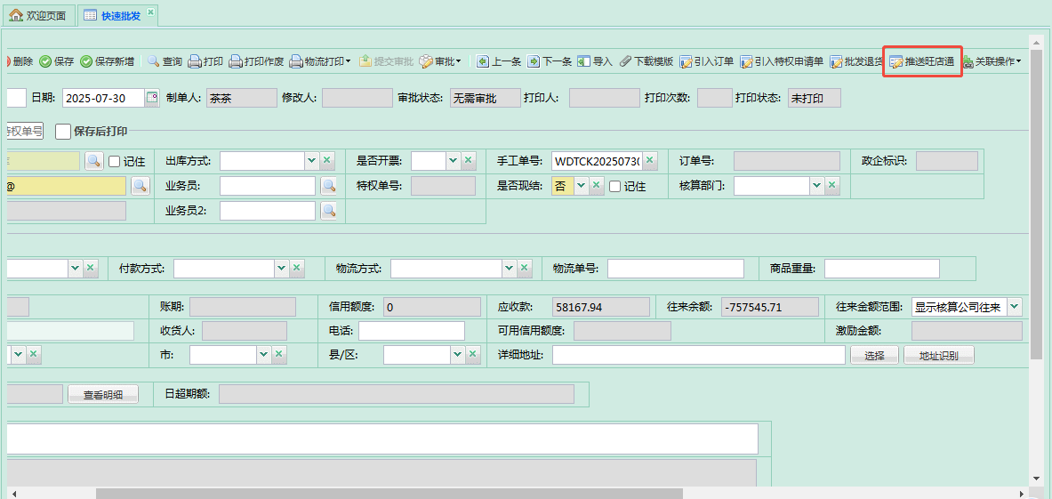 - 批发出库单、批发退货单头部增加 推送旺店通 按钮,可分配按钮权限;