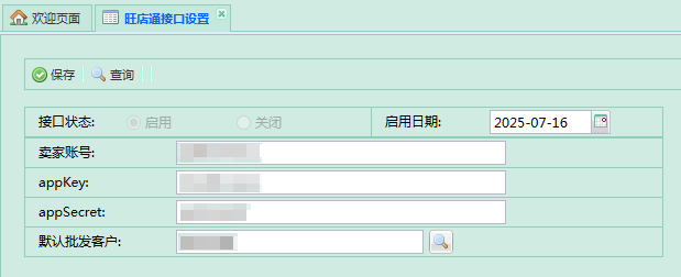 1、将旺店通系统提供的卖家账号、appkey、appsecret填写到接口设置中;再选择默认批发客户,保存数据;