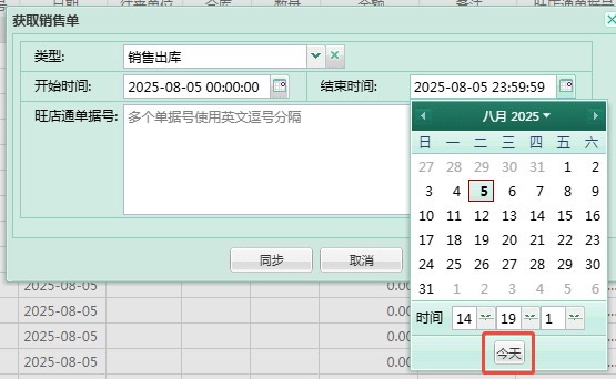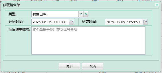 1、点击按钮弹框,输入旺店通单据号、开始结束日期 同步数据;