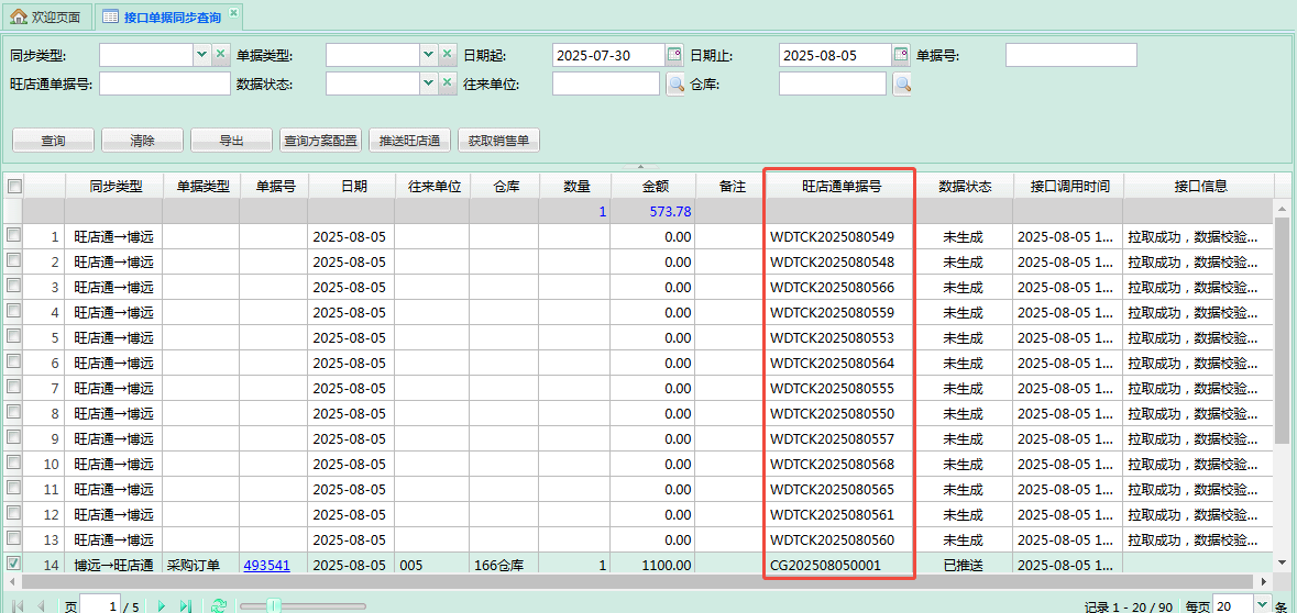 已生成:表示旺店通→博远的单据已生成ERP单据;