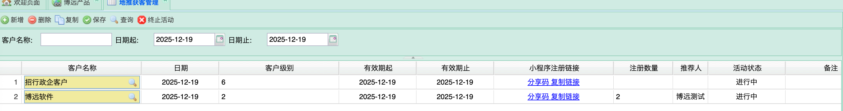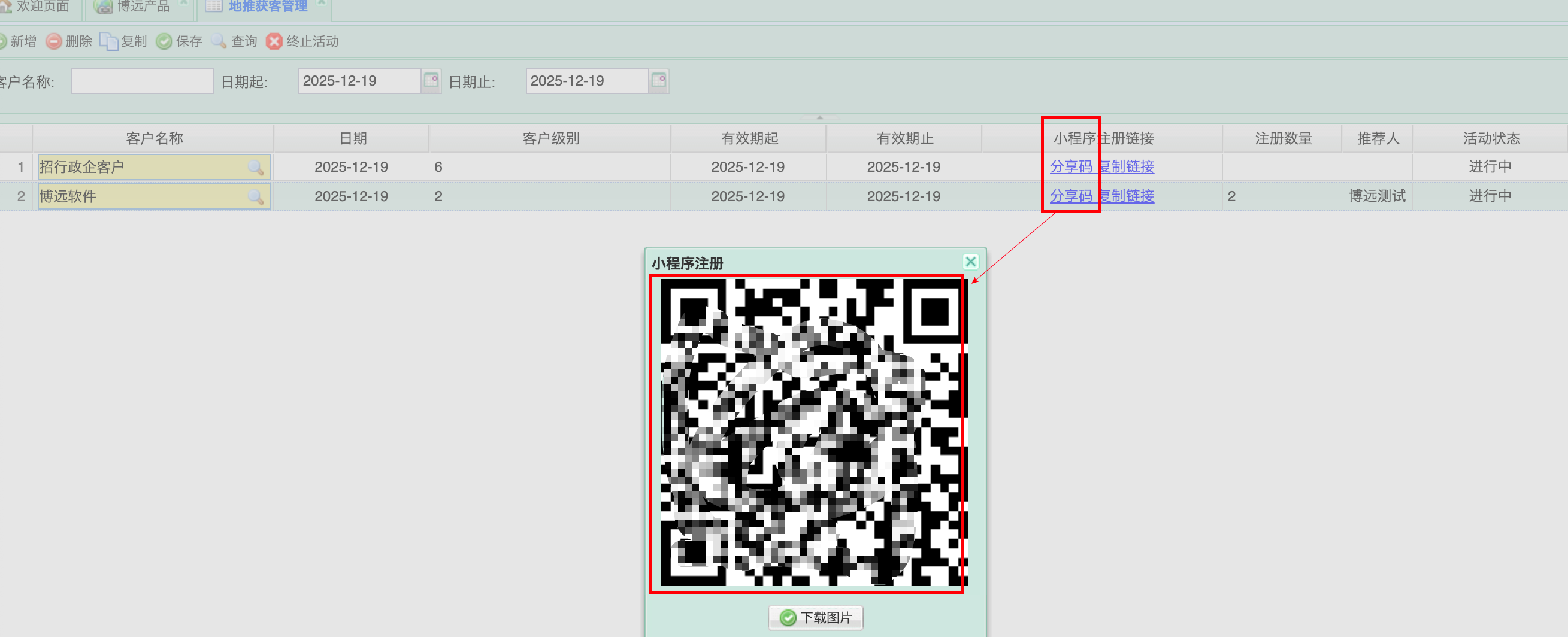 地推获客功能是针对线下推广场景设计的精准获客工具。通过在ERP后台创建专属推广活动,系统将自动生成可追踪的小程序二维码或注册链接。潜在客户扫码后,即可通过微信一键授权完成注册,并自动归属于预设的推广客户名下。