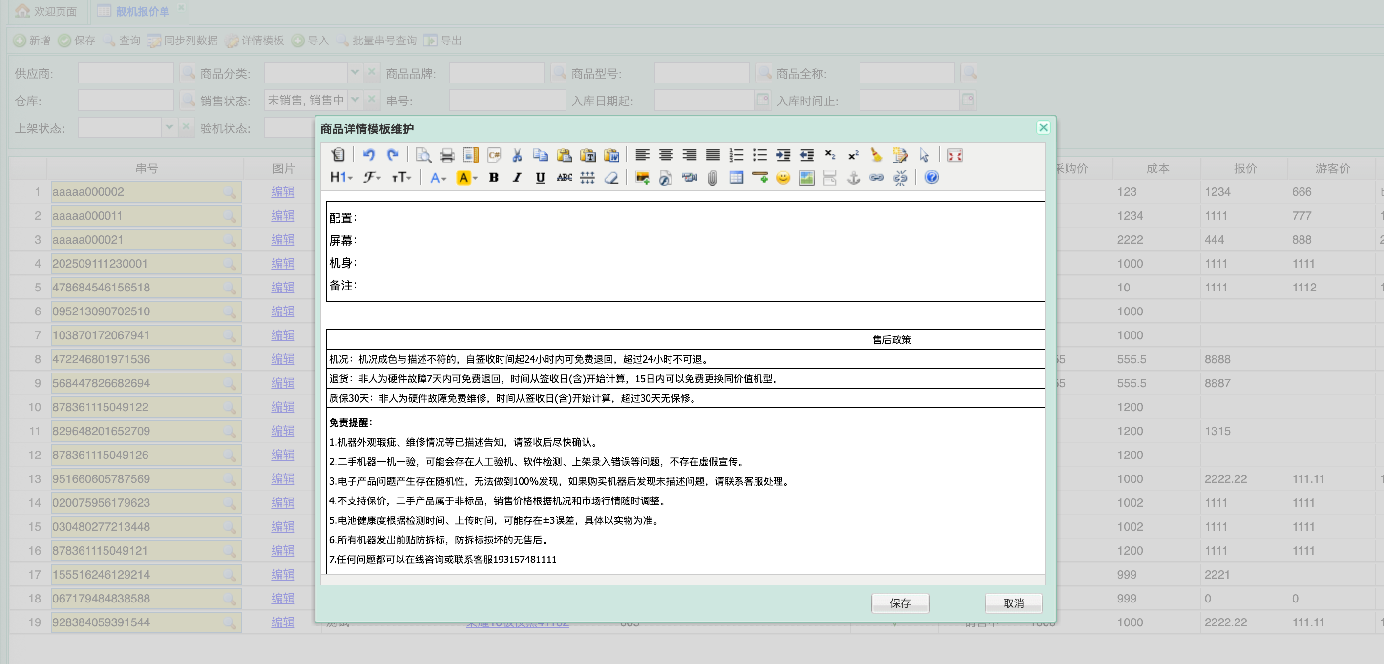 详情模版:点击单据头部的按钮“详情模版”维护完善资料:在列表字段中选择该串号的商品成色、版本、电池状况、外壳及功能描述等参数 。