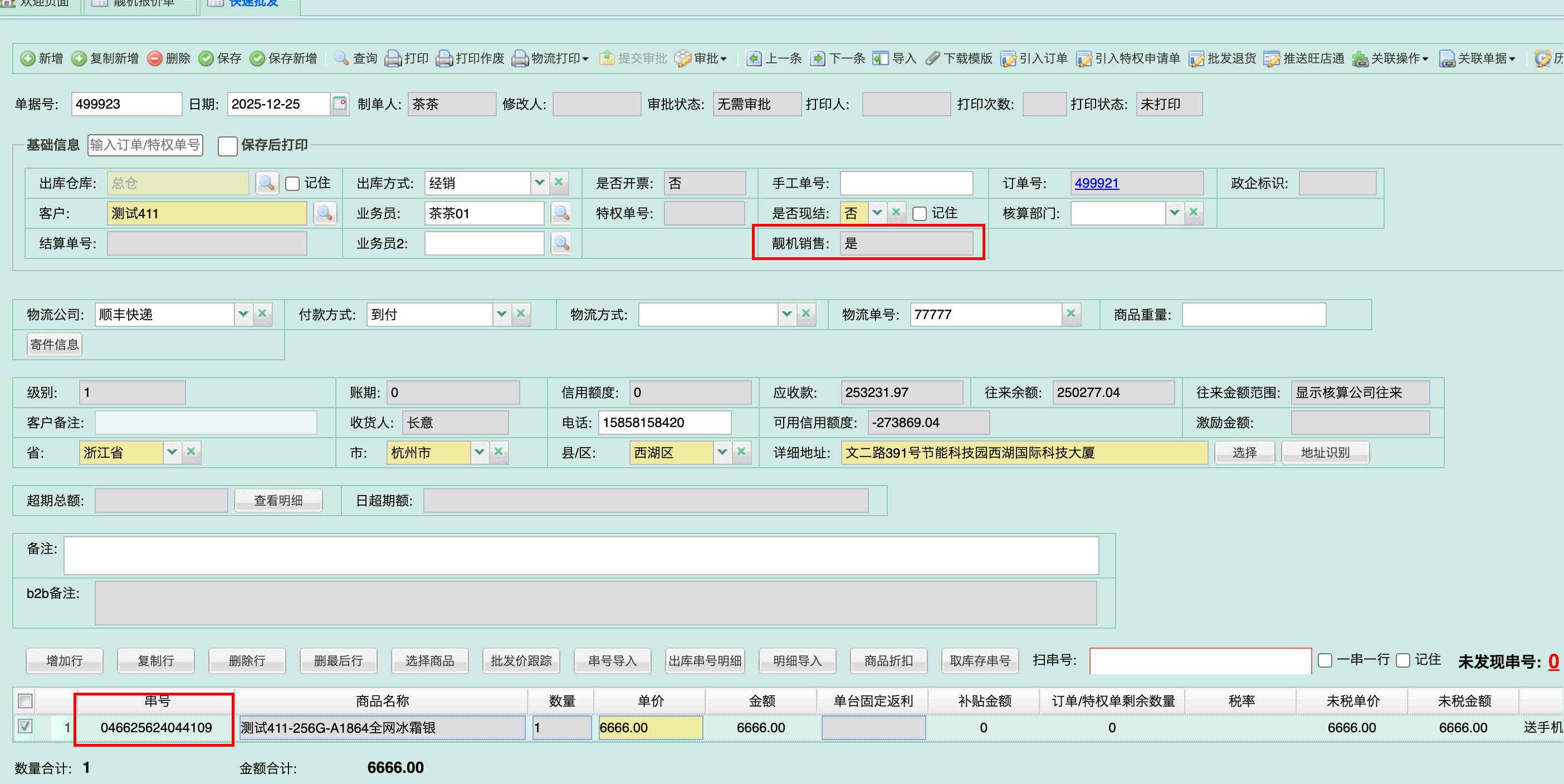 手工下单:后台录入时需先选择“靓机销售”标识,录入串号后方可保存 。