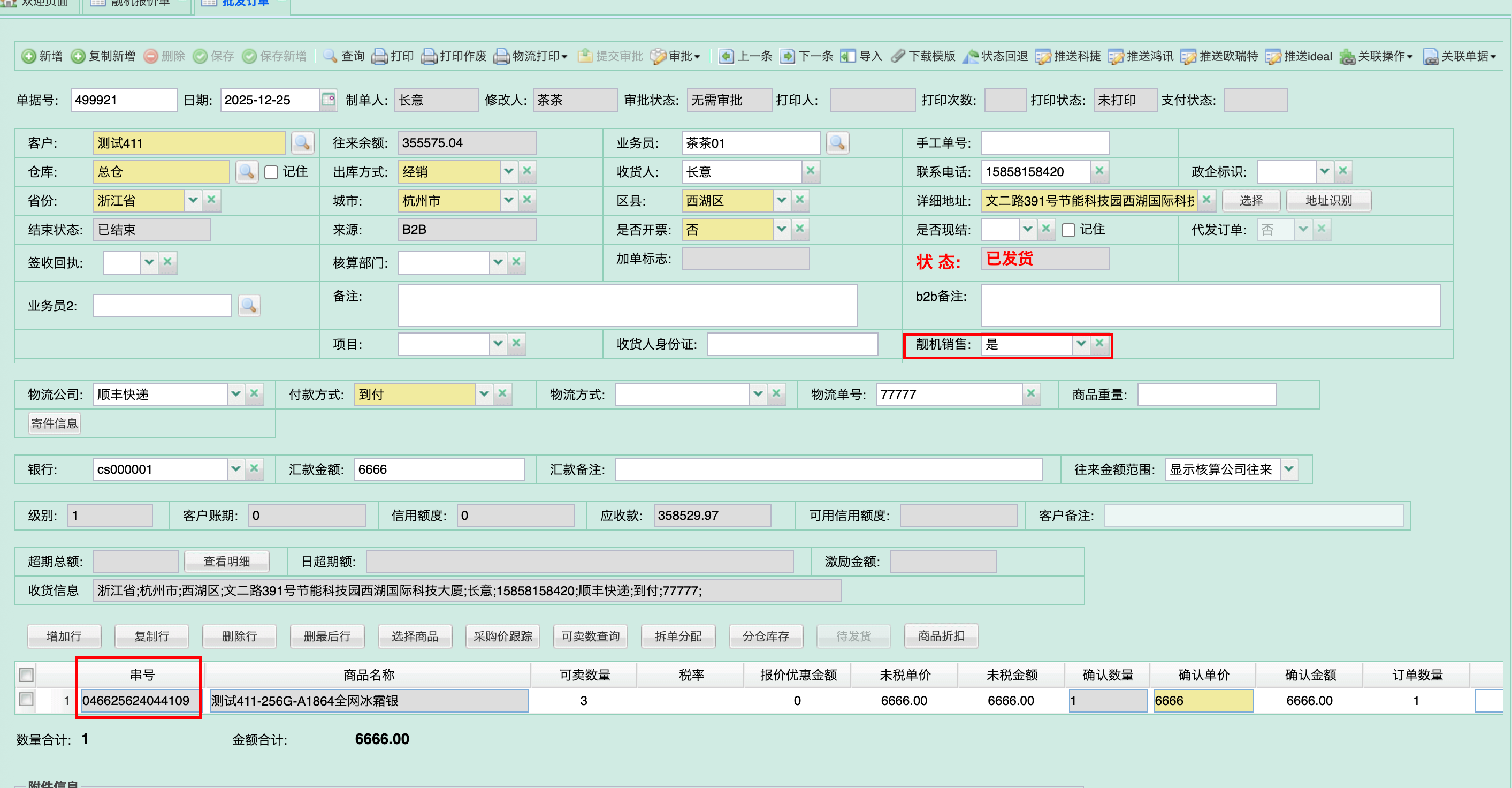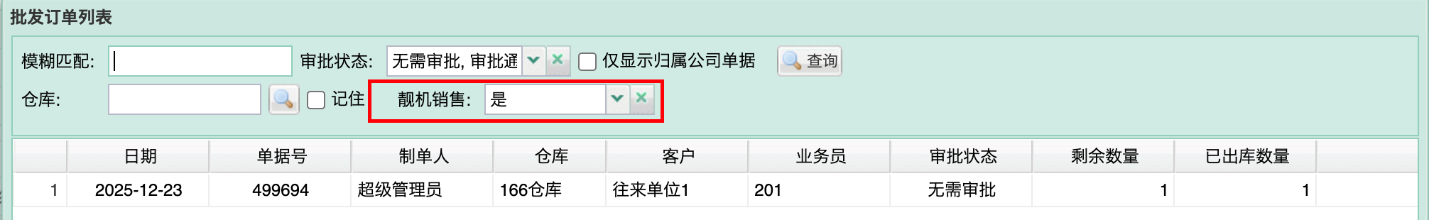 自动锁定:小程序产生的订单自动带入“靓机销售”标识,且明细行的串号、商品名称、数量(固定为 1)均锁定不可修改 。