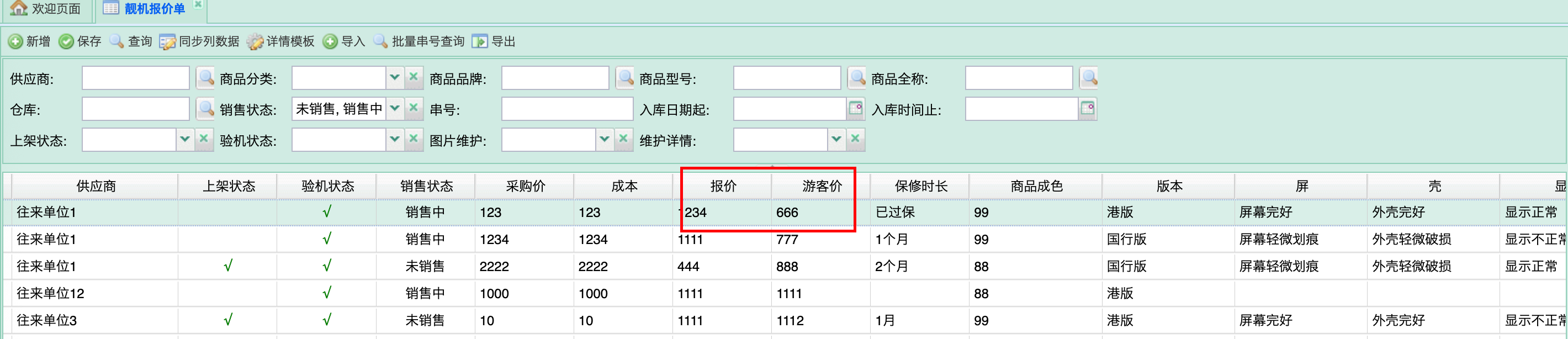 - 确认上架:勾选“上架状态”。注意:必须同时满足“在库、已勾选验机标识、报价 > 0”三个条件方可生效 。