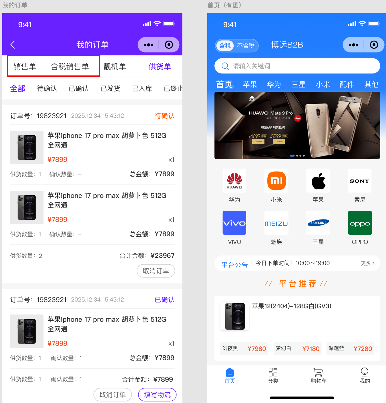 核心价值:客户只需登录一个账号,即可在小程序端无缝切换查看两种报价。下单时,系统会自动根据选择的报价类型,将订单分流至对应的业务主体(如:未税单归属 A 公司,含税单归属 B 公司),实现“前端一个账号,后端自动分单” 。