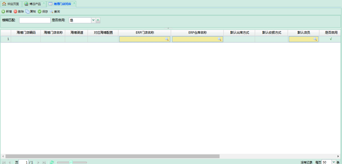 此菜单用于维护海博平台上的线上门店与ERP系统内部线下实体门店及仓库的对应关系。