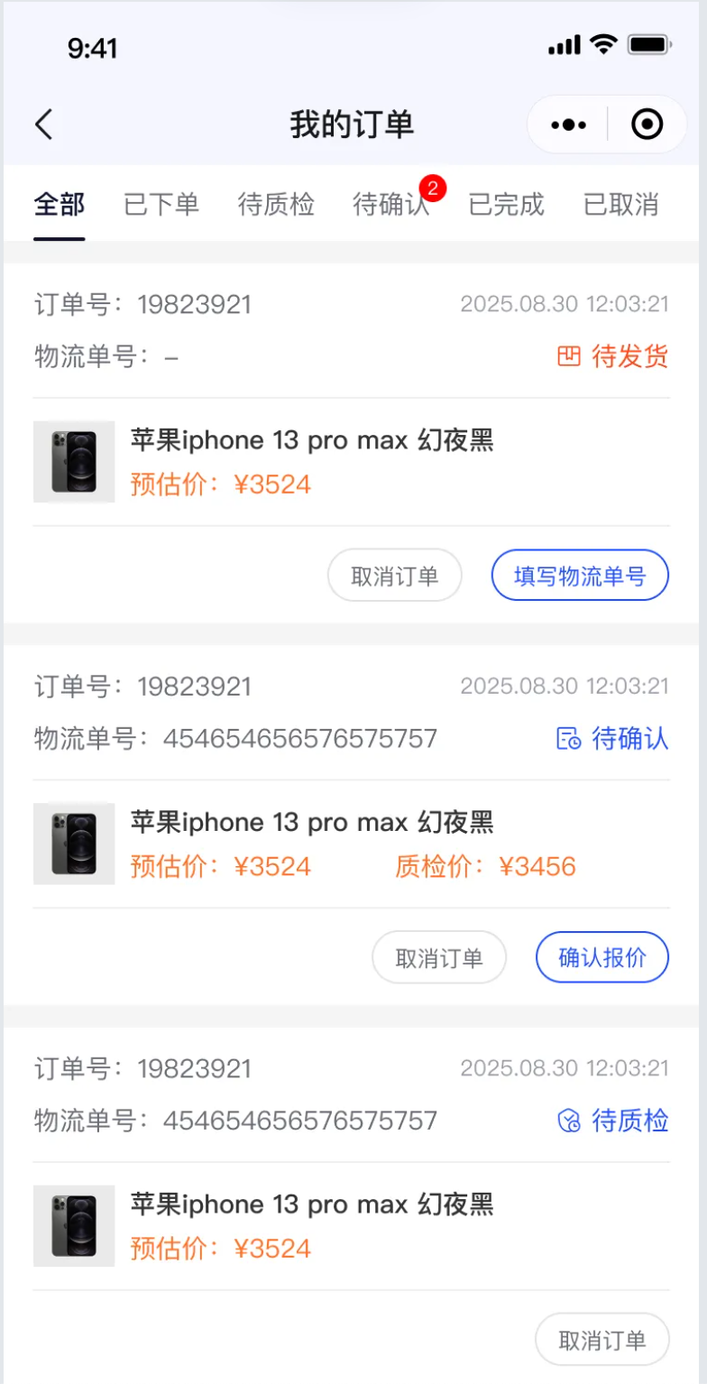 - 批量回收: 【批量回收】功能,支持用户直接提交多台手机发货信息和物流信息,满足企业客户和个人批量回收需求。